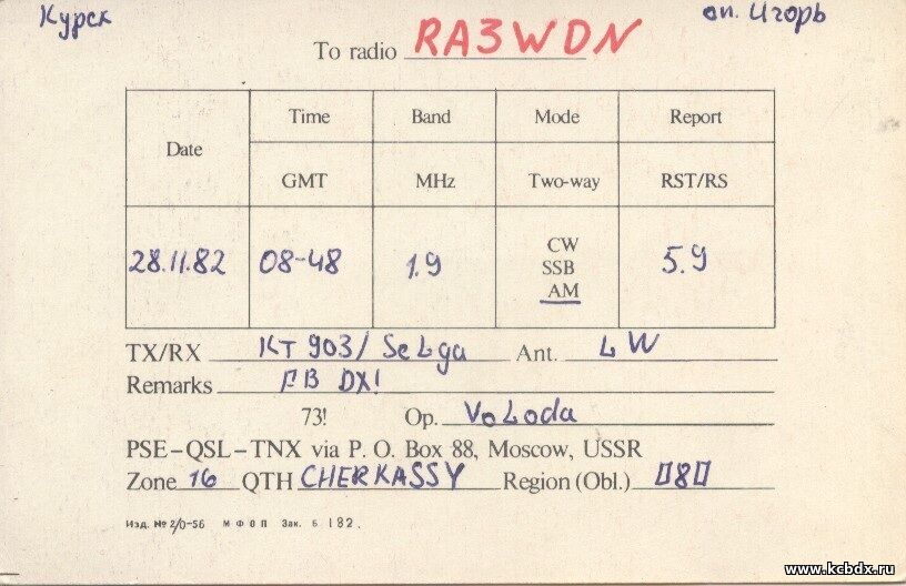 Карточка изготовлена в типографии. Резиновым штампиком нанесен личный коротковолновый позывной. Такую QSL карточку заполняли от руки и отправляли через QSL бюро радио технической школы ДОСААФ.