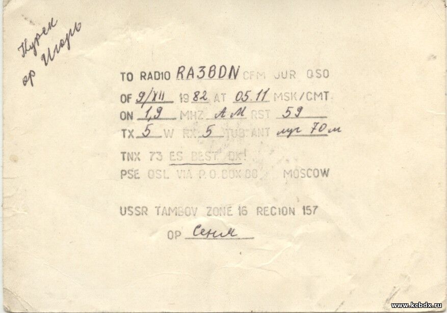 QSL карточка из города Тамбова, от 09 декабря 1982 года. RA3RСX - Op. Сеня. С тех пор прошло 44 года...