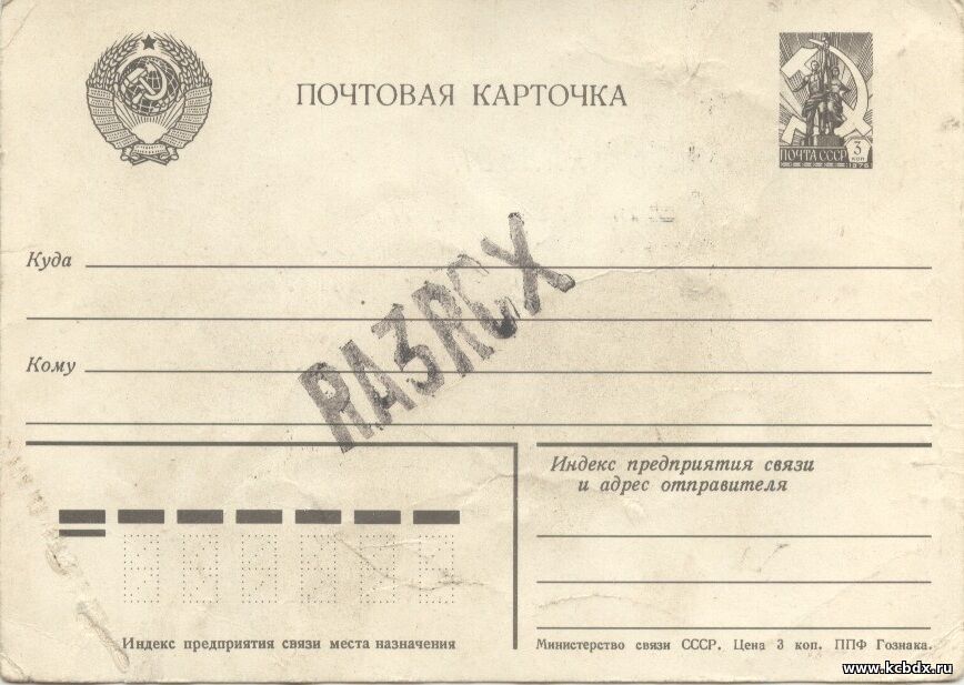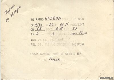 Почтовое уведомление, которое можно было купить в любом почтовом отделении почты СССР, всего за 3 копейки. Поставить штампик - таблицу RST и переделать в QSL карточку. Кстати, Сеня по запарке, в моем позывном, вместо латинской буквы "W", написал русскую букву "В". В жизни всякое бывает... Резиновым штампиком нанесена табличка для заполнения QSL карточки и личный коротковолновый позывной. Такую QSL карточку заполняли от руки и отправляли через QSL бюро радио технической школы ДОСААФ.