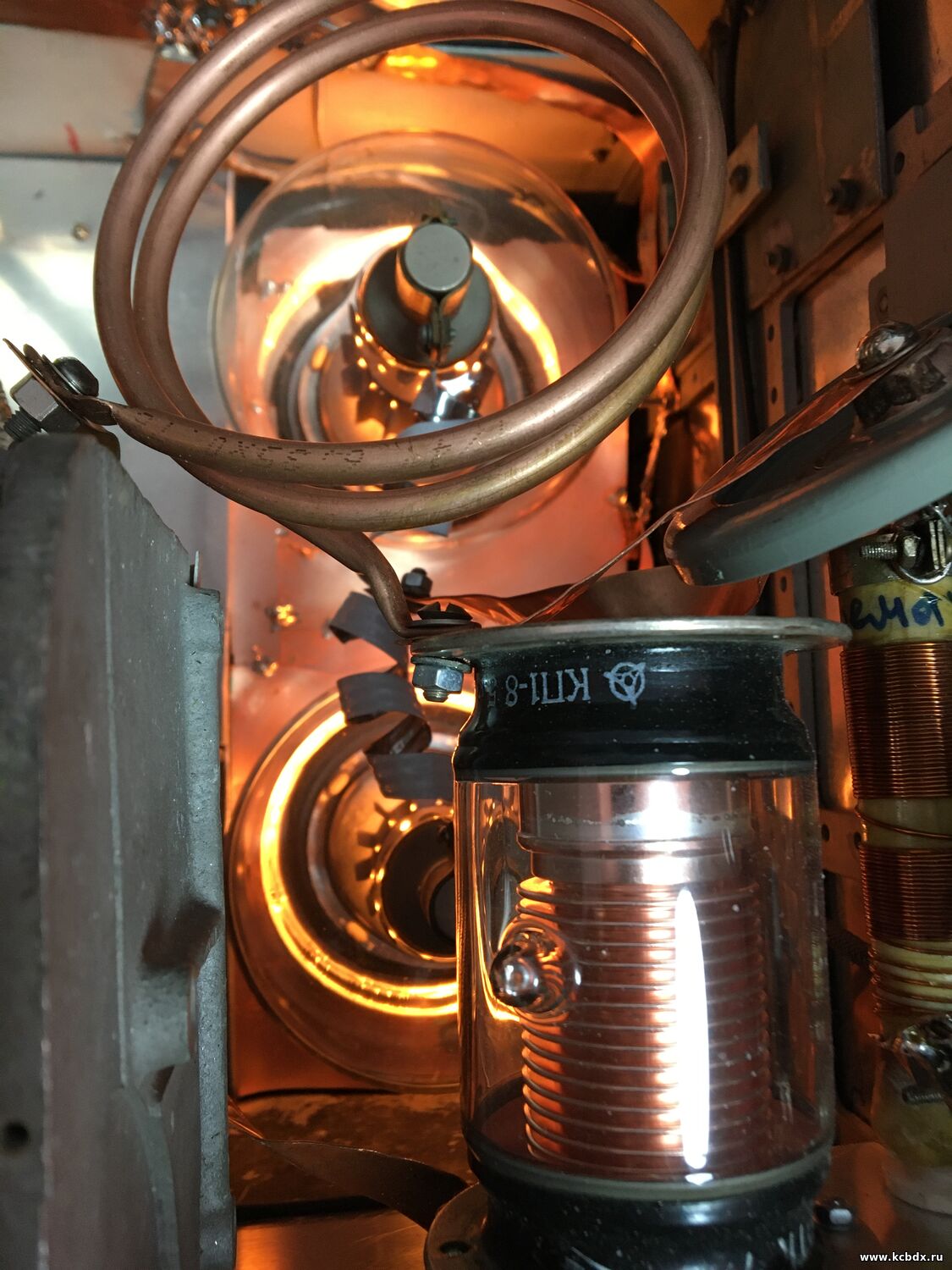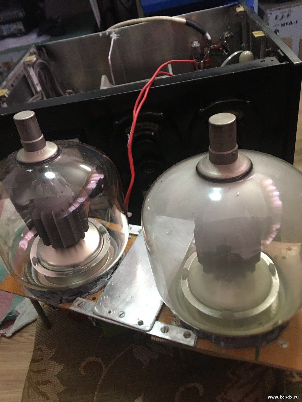 | Фото с включенным накалом. Этот усилитель сделан по схеме с общим катодом и у него низкое входное сопротивление 540ом, для более устойчивой работы, поэтому по входу нужна раскачка под 70 ватт.
